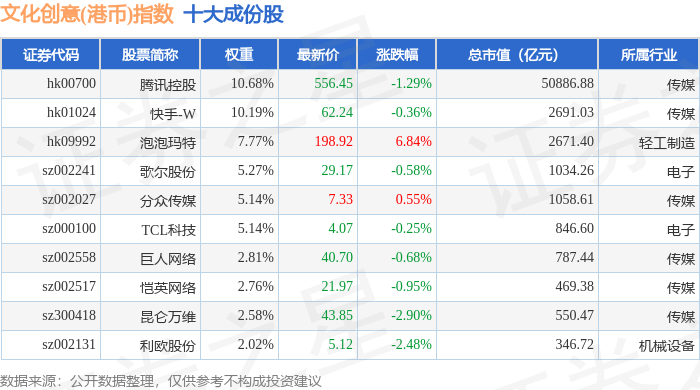 文化创意(港币)(980047)指数十大成份股详情如下: