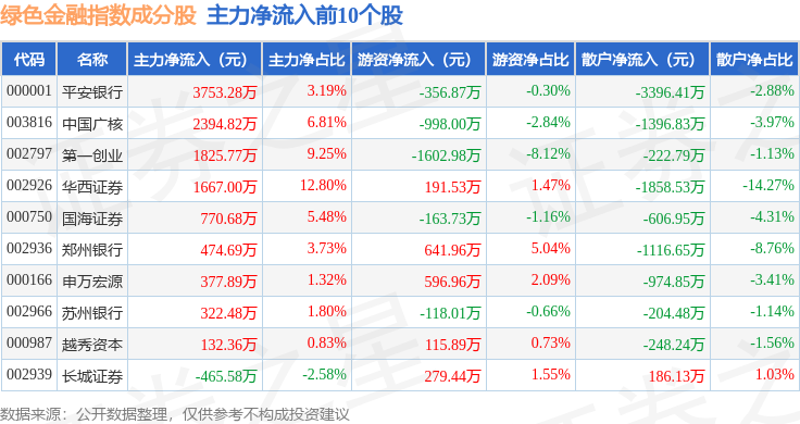 资金流向方面,绿色金融(980052)指数成份股当日主力资金净流出合计4.96亿元,游资资金净流入合计1.4亿元,散户资金净流入合计3.55亿元。成份股资金流向详情见下表: