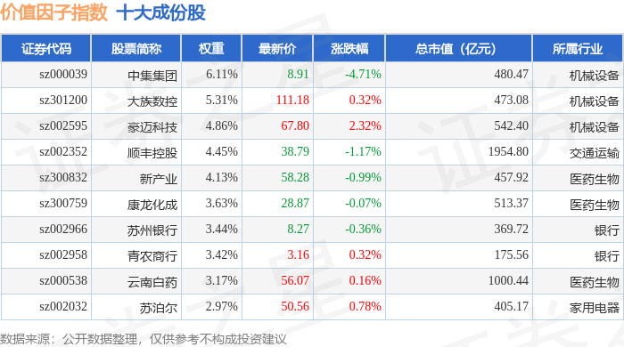 资金流向方面,价值因子(980056)指数成份股当日主力资金净流出合计11.98亿元,游资资金净流入合计5.14亿元,散户资金净流入合计6.84亿元。成份股资金流向详情见下表: