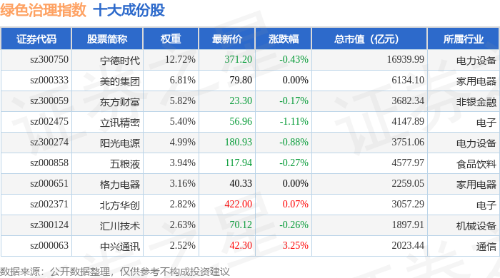 资金流向方面,绿色治理(980058)指数成份股当日主力资金净流出合计11.27亿元,游资资金净流出合计909.81万元,散户资金净流入合计11.36亿元。成份股资金流向详情见下表: