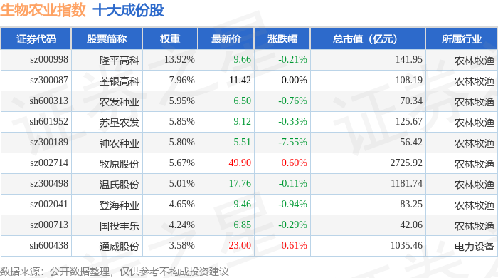 资金流向方面,生物农业(980072)指数成份股当日主力资金净流出合计1.26亿元,游资资金净流出合计7254.12万元,散户资金净流入合计1.59亿元。成份股资金流向详情见下表: