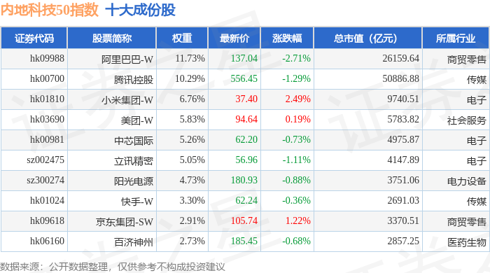 证券之星消息,11月27日,内地科技50(983003)指数报收于2966.94点,跌0.38%,成交1050.26亿元,换手率0.92%。当日该指数成份股中,上涨的有19家,中兴通讯以3.25%的涨幅领涨,下跌的有31家,阿里健康以5.57%的跌幅领跌。