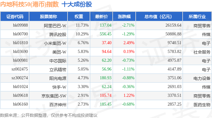 内地科技50(港币)(983004)指数十大成份股详情如下: