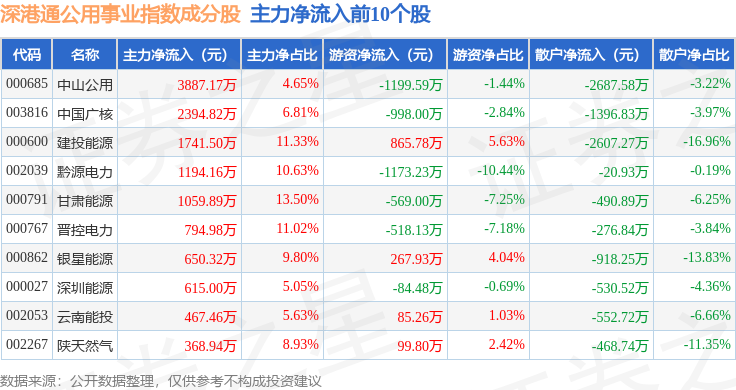 资金流向方面,深港通公用事业(983031)指数成份股当日主力资金净流出合计3774.99万元,游资资金净流入合计3585.72万元,散户资金净流入合计189.28万元。成份股资金流向详情见下表: