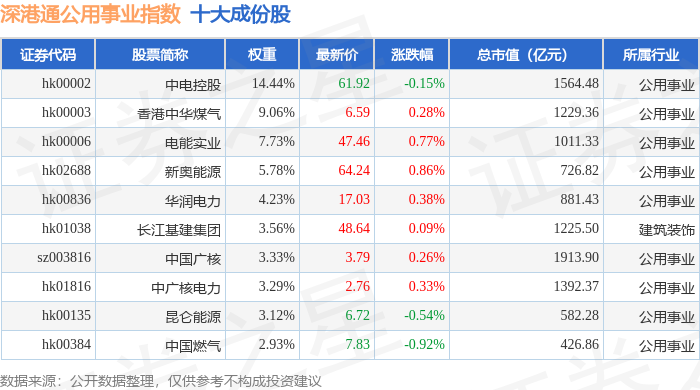 证券之星消息,11月27日,深港通公用事业(983031)指数报收于4430.96点,涨0.36%,成交69.41亿元,换手率0.42%。当日该指数成份股中,上涨的有47家,中山公用以5.56%的涨幅领涨,下跌的有12家,赫美集团以2.42%的跌幅领跌。