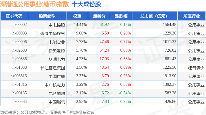 深港通公用事业(港币)(983032)指数十大成份股详情如下:
