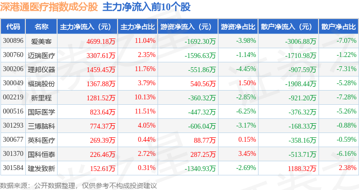 资金流向方面,深港通医疗(983035)指数成份股当日主力资金净流出合计5882.68万元,游资资金净流出合计1924.8万元,散户资金净流入合计7807.48万元。成份股资金流向详情见下表: