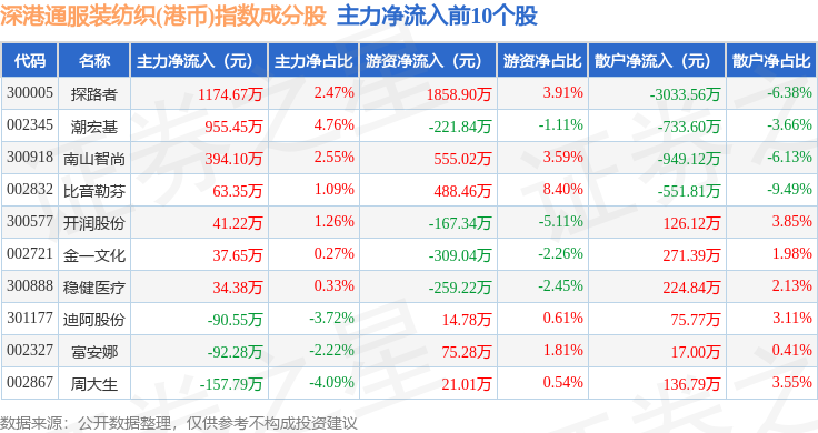 资金流向方面,深港通服装纺织(港币)(983042)指数成份股当日主力资金净流出合计1.36亿元,游资资金净流入合计3949.75万元,散户资金净流入合计9661.16万元。成份股资金流向详情见下表: