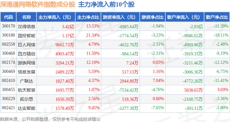 资金流向方面,深港通网络软件(983047)指数成份股当日主力资金净流出合计31.61亿元,游资资金净流入合计3.87亿元,散户资金净流入合计27.73亿元。成份股资金流向详情见下表: