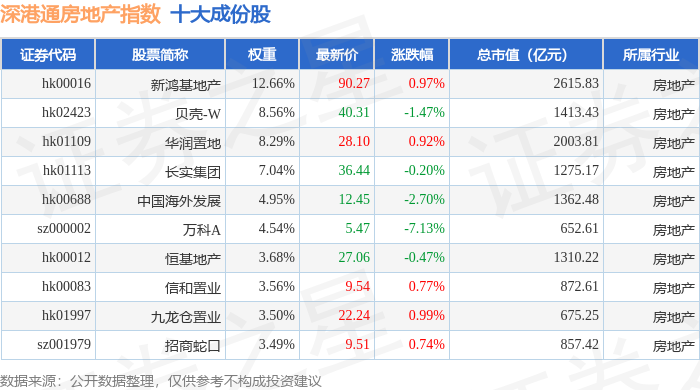 证券之星消息,11月27日,深港通房地产(983071)指数报收于2365.44点,跌0.47%,成交133.42亿元,换手率1.04%。当日该指数成份股中,上涨的有21家,上海实业控股以2.42%的涨幅领涨,下跌的有47家,万科企业以7.73%的跌幅领跌。