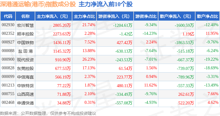 资金流向方面,深港通运输(港币)(983078)指数成份股当日主力资金净流出合计1.78亿元,游资资金净流出合计8732.41万元,散户资金净流入合计2.65亿元。成份股资金流向详情见下表: