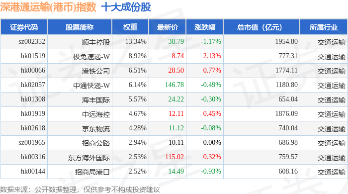 深港通运输(港币)(983078)指数十大成份股详情如下:
