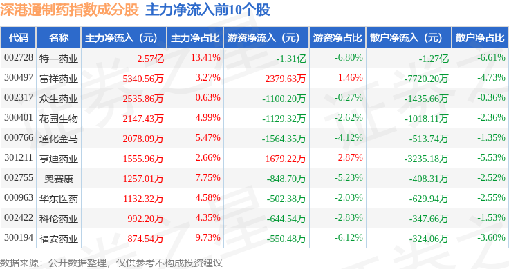 资金流向方面,深港通制药(983079)指数成份股当日主力资金净流出合计2.74亿元,游资资金净流出合计732.98万元,散户资金净流入合计2.82亿元。成份股资金流向详情见下表: