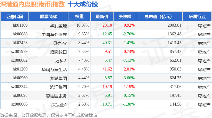 深港通内房股(港币)(983084)指数十大成份股详情如下: