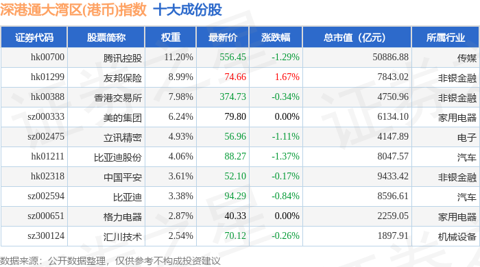 深港通大湾区(港币)(983090)指数十大成份股详情如下: