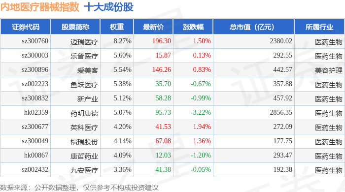 证券之星消息,11月27日,内地医疗器械(983103)指数报收于1790.91点,跌0.16%,成交82.06亿元,换手率1.03%。当日该指数成份股中,上涨的有28家,泰林生物以4.9%的涨幅领涨,下跌的有21家,药明康德以3.22%的跌幅领跌。