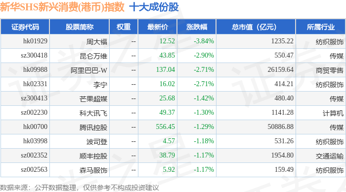 新华SHS新兴消费(港币)(989007)指数十大成份股详情如下: