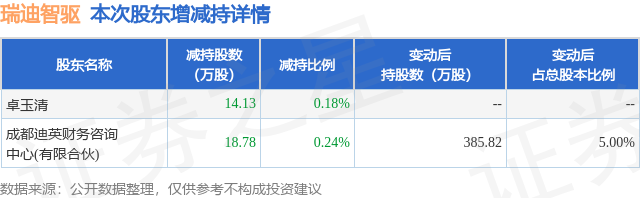 证券之星消息,11月27日瑞迪智驱发布公告《瑞迪智驱:关于公司股东股份减持计划届满的公告》,其股东卓玉清、成都迪英财务咨询中心(有限合伙)于2025年9月2日至2025年11月26日间合计减持32.91万股,占公司目前总股本的0.4265%,变动期间该股股价下跌22.4%,截止11月26日收盘报71.84元。
