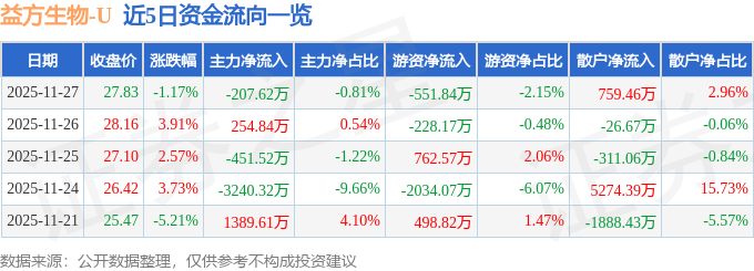 证券之星消息,截至2025年11月27日收盘,益方生物(688382)报收于27.83元,下跌1.17%,换手率2.21%,成交量9.21万手,成交额2.57亿元。