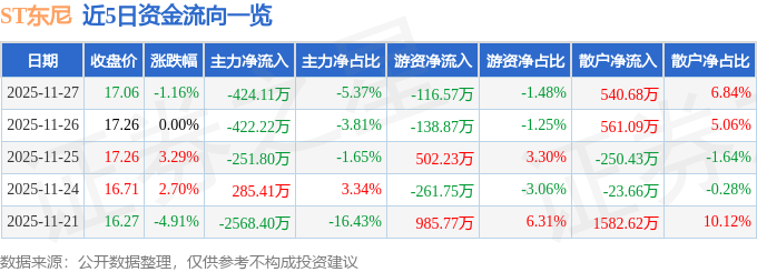 证券之星消息,截至2025年11月27日收盘,ST东尼(603595)报收于17.06元,下跌1.16%,换手率1.97%,成交量4.58万手,成交额7899.14万元。