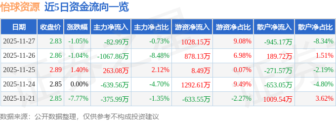证券之星消息,截至2025年11月27日收盘,怡球资源(601388)报收于2.83元,下跌1.05%,换手率1.8%,成交量39.66万手,成交额1.13亿元。