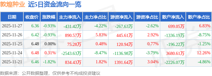 证券之星消息,截至2025年11月27日收盘,敦煌种业(600354)报收于6.36元,下跌0.93%,换手率3.04%,成交量16.07万手,成交额1.02亿元。