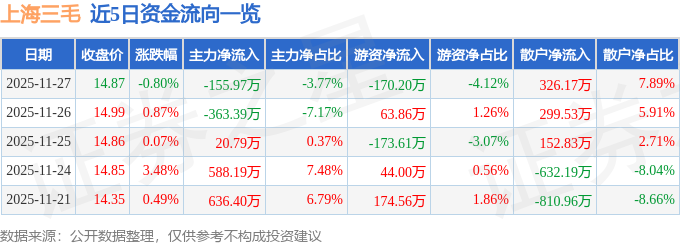 证券之星消息,截至2025年11月27日收盘,上海三毛(600689)报收于14.87元,下跌0.8%,换手率1.82%,成交量2.77万手,成交额4131.57万元。