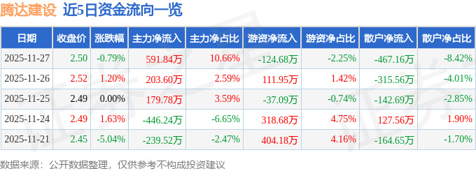 证券之星消息,截至2025年11月27日收盘,腾达建设(600512)报收于2.5元,下跌0.79%,换手率1.4%,成交量22.15万手,成交额5550.3万元。