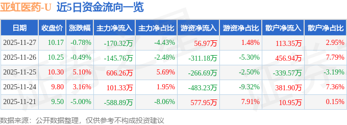 证券之星消息,截至2025年11月27日收盘,亚虹医药(688176)报收于10.17元,下跌0.78%,换手率0.86%,成交量3.77万手,成交额3845.4万元。
