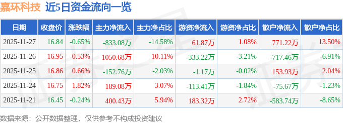证券之星消息,截至2025年11月27日收盘,嘉环科技(603206)报收于16.84元,下跌0.65%,换手率1.11%,成交量3.38万手,成交额5714.14万元。