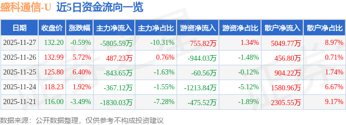 证券之星消息,截至2025年11月27日收盘,盛科通信(688702)报收于132.2元,下跌0.59%,换手率2.07%,成交量4.19万手,成交额5.63亿元。