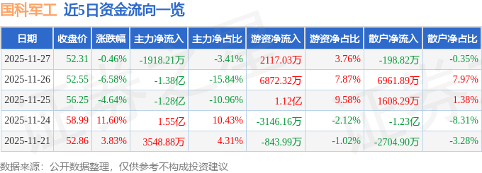 证券之星消息,截至2025年11月27日收盘,国科军工(688543)报收于52.31元,下跌0.46%,换手率9.24%,成交量10.72万手,成交额5.63亿元。