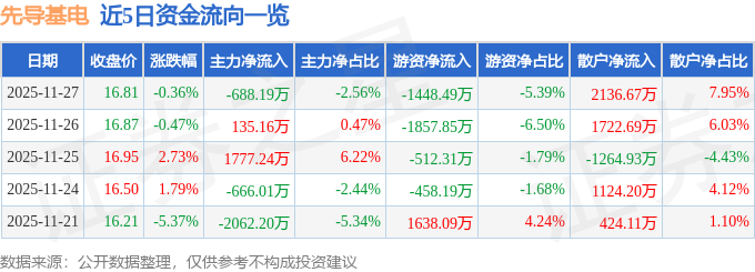 证券之星消息,截至2025年11月27日收盘,先导基电(600641)报收于16.81元,下跌0.36%,换手率1.7%,成交量15.81万手,成交额2.69亿元。