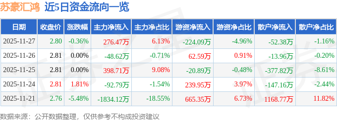证券之星消息,截至2025年11月27日收盘,苏豪汇鸿(600981)报收于2.8元,下跌0.36%,换手率0.72%,成交量16.04万手,成交额4513.52万元。