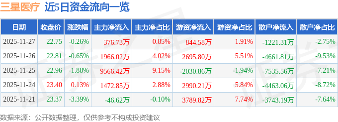 证券之星消息,截至2025年11月27日收盘,三星医疗(601567)报收于22.75元,下跌0.26%,换手率1.38%,成交量19.42万手,成交额4.43亿元。