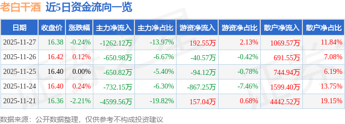 证券之星消息,截至2025年11月27日收盘,老白干酒(600559)报收于16.38元,下跌0.24%,换手率0.61%,成交量5.51万手,成交额9031.79万元。