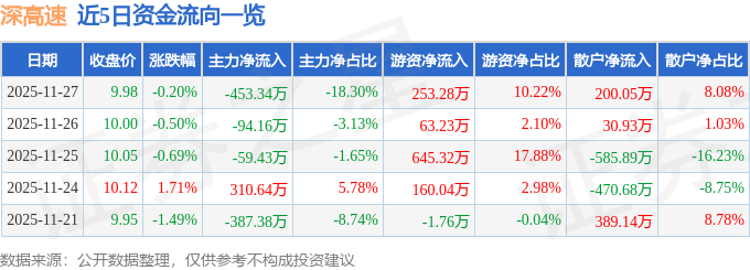 证券之星消息,截至2025年11月27日收盘,深高速(600548)报收于9.98元,下跌0.2%,换手率0.14%,成交量2.48万手,成交额2477.42万元。