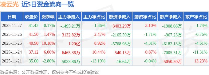 证券之星消息,截至2025年11月27日收盘,凌云光(688400)报收于41.43元,下跌0.17%,换手率5.64%,成交量26.01万手,成交额10.97亿元。
