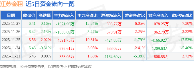 证券之星消息,截至2025年11月27日收盘,江苏金租(600901)报收于6.41元,下跌0.16%,换手率0.4%,成交量22.94万手,成交额1.48亿元。