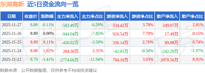 证券之星消息,截至2025年11月27日收盘,东湖高新(600133)报收于8.88元,下跌0.11%,换手率0.93%,成交量9.96万手,成交额8856.7万元。