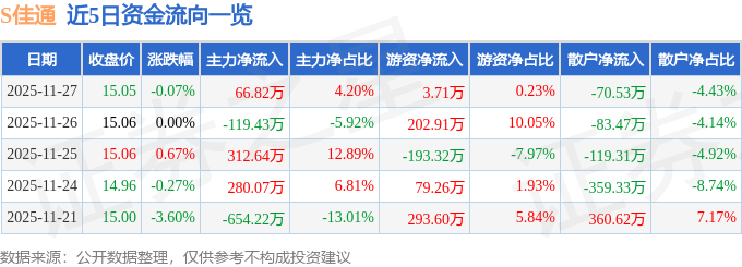 11月27日的资金流向数据方面,主力资金净流入66.82万元,占总成交额4.2%,游资资金净流入3.71万元,占总成交额0.23%,散户资金净流出70.53万元,占总成交额4.43%。