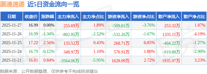 证券之星消息,截至2025年11月27日收盘,圆通速递(600233)报收于16.99元,上涨0.0%,换手率0.23%,成交量7.96万手,成交额1.36亿元。