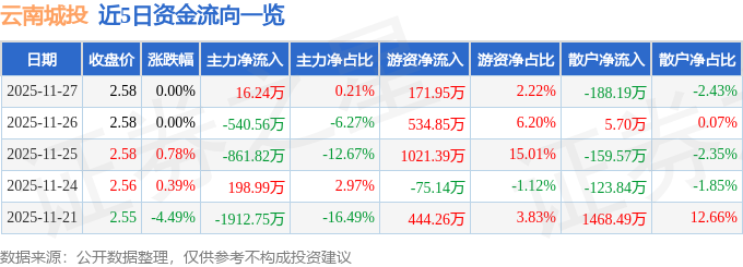 证券之星消息,截至2025年11月27日收盘,云南城投(600239)报收于2.58元,上涨0.0%,换手率1.87%,成交量30.1万手,成交额7750.73万元。