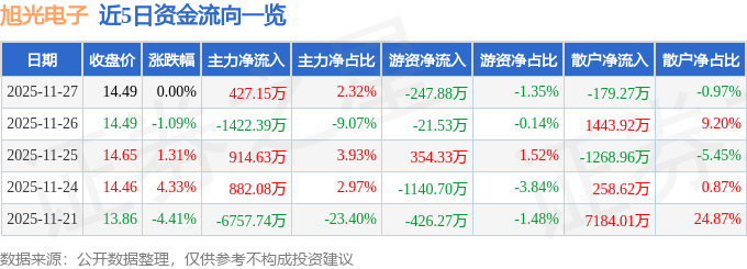 11月27日的资金流向数据方面,主力资金净流入427.15万元,占总成交额2.32%,游资资金净流出247.88万元,占总成交额1.35%,散户资金净流出179.27万元,占总成交额0.97%。