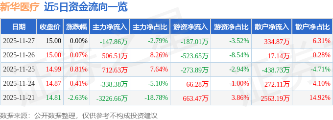 证券之星消息,截至2025年11月27日收盘,新华医疗(600587)报收于15.0元,上涨0.0%,换手率0.59%,成交量3.54万手,成交额5307.25万元。
