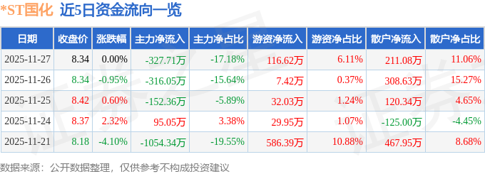 证券之星消息,截至2025年11月27日收盘,*ST国化(600636)报收于8.34元,上涨0.0%,换手率0.52%,成交量2.28万手,成交额1907.67万元。