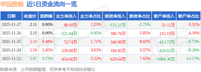 证券之星消息,截至2025年11月27日收盘,华远控股(600743)报收于2.11元,上涨0.0%,换手率0.81%,成交量19.1万手,成交额4042.66万元。