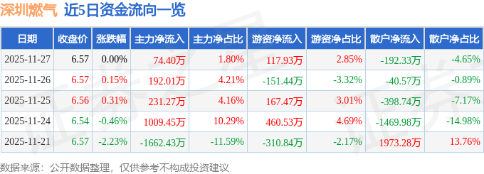证券之星消息,截至2025年11月27日收盘,深圳燃气(601139)报收于6.57元,上涨0.0%,换手率0.22%,成交量6.3万手,成交额4138.22万元。