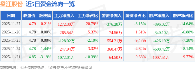 证券之星消息,截至2025年11月27日收盘,盘江股份(600395)报收于4.79元,上涨0.21%,换手率0.6%,成交量12.77万手,成交额6120.41万元。