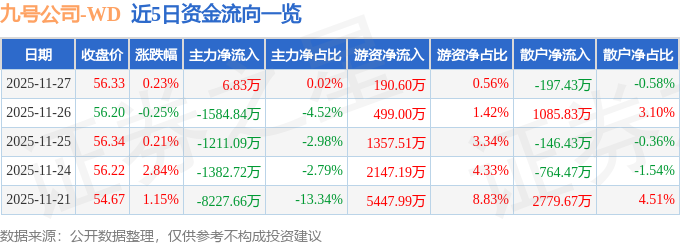 11月27日的资金流向数据方面,主力资金净流入6.83万元,占总成交额0.02%,游资资金净流入190.6万元,占总成交额0.56%,散户资金净流出197.43万元,占总成交额0.58%。